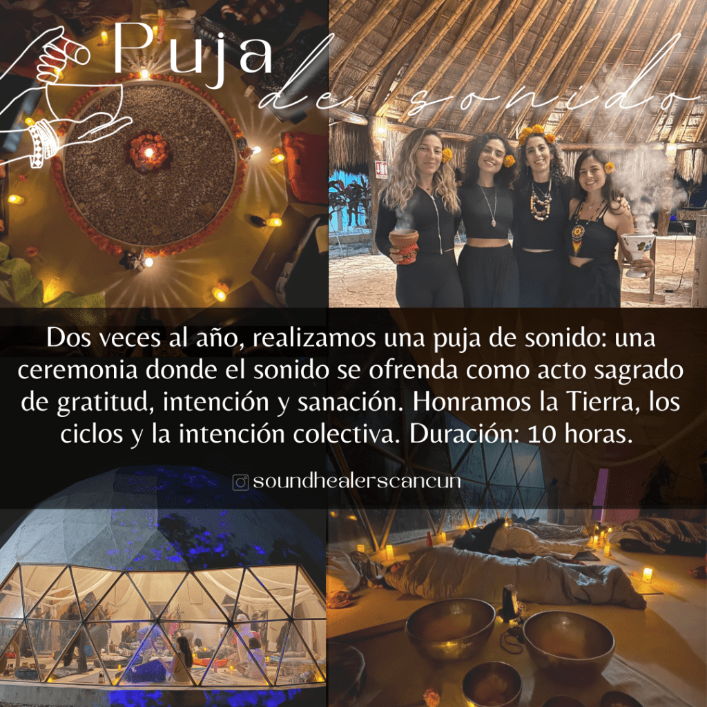 PUJA DE SONIDO- Dos veces al año, realizamos una puja de sonido: una ceremonia de duración 10 horas, donde el sonido se ofrenda como acto sagrado de gratitud, intención y sanación. Honramos la tierra, los ciclos y la intención colectiva.